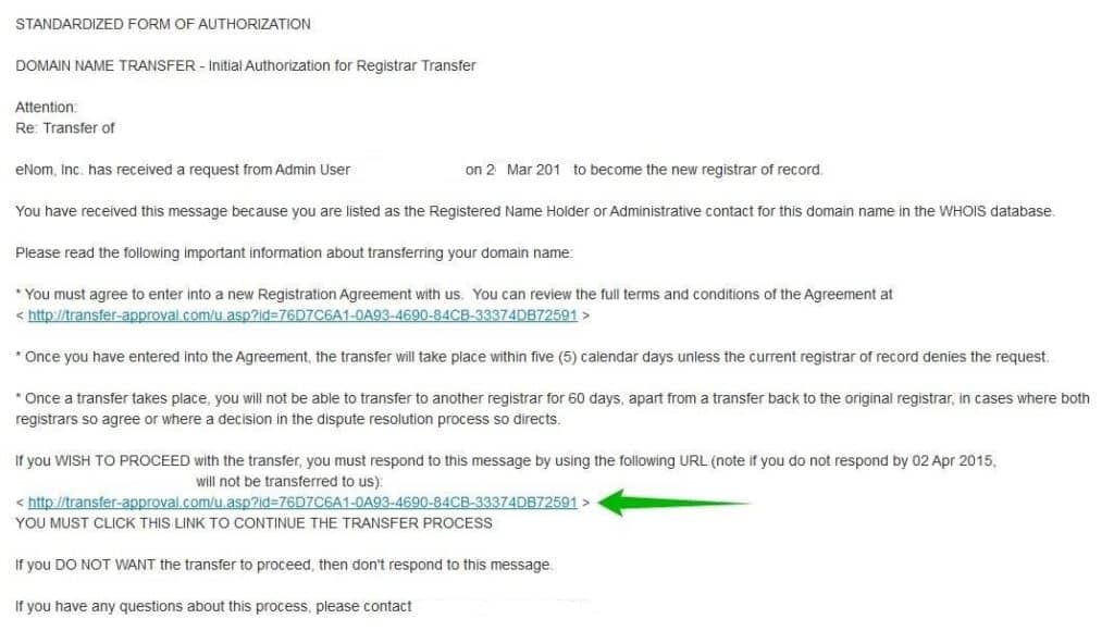 Η διαδικασία έγκρισης μεταφοράς ενός Domain name, αφορά την αποδοχή του ιδιοκτήτη, στο email που θα λάβει από το μητρώο ονομάτων. Το email επιβεβαίωσης αποστέλλεται στον ιδιοκτήτη 12-24 ώρες από την αίτηση αλλαγής καταχωρητή.