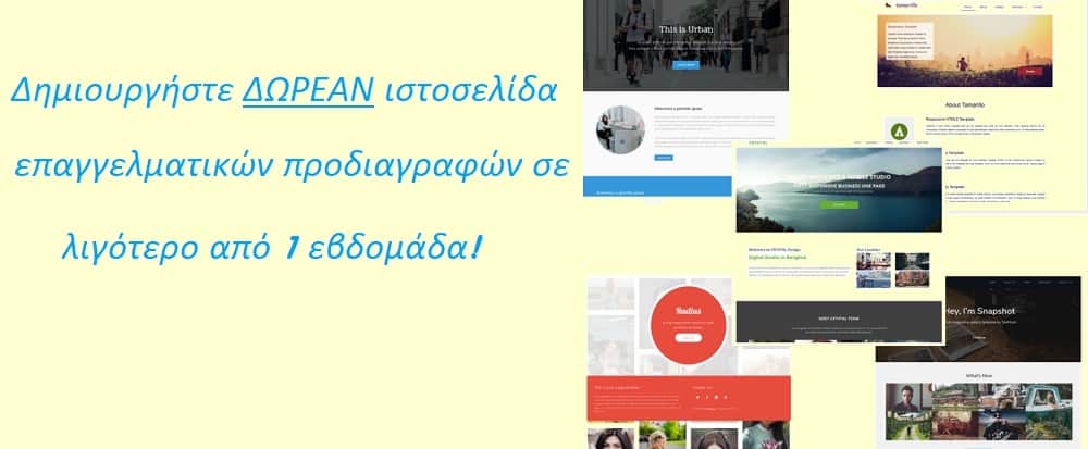 Επιθυμείτε να κατασκευάσετε μια ιστοσελίδα, αλλά δεν γνωρίζετε τον τρόπο; Αγχώνεστε μήπως το δημιούργημα σας θα φαίνεται “ερασιτεχνικό”; Δημιουργήσαμε για εσάς τον απόλυτο οδηγό για να δημιουργήσετε μόνοι σας, ΕΝΤΕΛΩΣ ΔΩΡΕΑΝ την δική σας ιστοσελίδα, η οποία δεν υστερεί σε τίποτα από μια επαγγελματική κατασκευή!