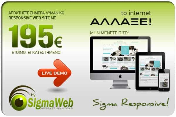 Η ανατροπή στα δυναμικά websites έφτασε και η SigmaWeb σας προσφέρει την απόλυτη λύση στην ανταγωνιστικότερη τιμή της αγοράς: Αποκτήστε δυναμική & ανανεωμένη εταιρική παρουσία στην εκπληκτική τιμή των 195€ με το Sigma Responsive!