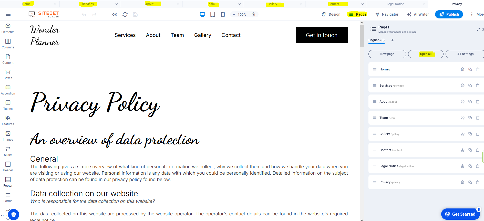 Για να επεξεργαστείτε τις διαθέσιμες σελίδες του template , κλικάρετε στον top header την επιλογή PAGES, έπειτα στο tab που θα σας εμφανιστεί open all. Στη συνέχεια επιλέγετε την σελίδα που επιθυμείτε να επεξεργαστείτε (δείτε τα κίτρινα σημεία στο screenshot).