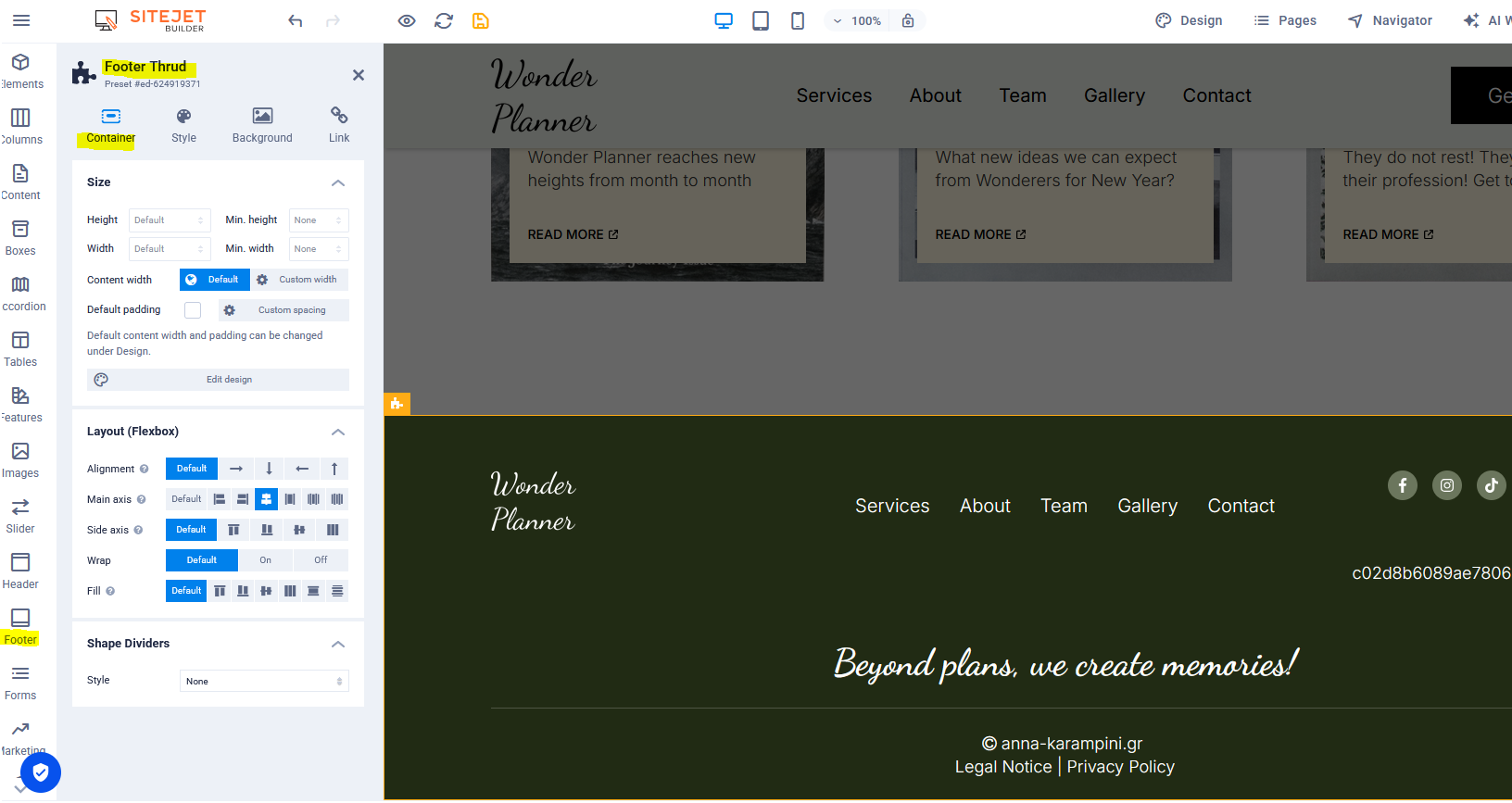 Επίσης και αυτό να το βρείτε στην αριστερή πλευρά, όπως κοιτάτε την οθόνη σας μέσα στο Site Website Builder .Θα πρέπει να ”μαρκάρετε” την περιοχή του footer για να σας ανοίξει το tab με όλες τις διαθέσιμες παραμετροποιήσεις. Εδώ θα βρείτε tab container το οποίο απευθύνεται στην επεξεργασία του περιεχομένου καθώς και το tab background. Στο tab link έχετε την δυνατότητα να ορίσετε υπερσύνδεσμο (δείτε τα κίτρινα σημεία στο screenshot).