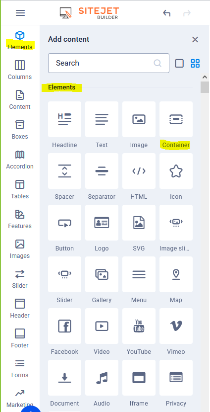 Μπορείτε να το βρείτε στην αριστερή πλευρά, όπως κοιτάτε την οθόνη σας μέσα στο Site Website Builder . Στα elements θα ανατρέξετε αρκετές φορές γιατί παρέχουν την δυνατότητα επεξεργασίας αρκετών σημείων του template όπως για παράδειγμα, του header, banners, menu bar, info bar κτλ. Παρακάτω θα βρείτε σε screenshots κάποιες βασικές επεξεργασίες (δείτε τα κίτρινα σημεία στο screenshot).
