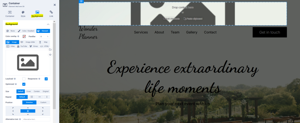 Ένα ακόμη παράδειγμα σχετικό με το tab container, είναι ότι μπορείτε να επεξεργαστείτε και το background, ανεβάζοντας εικόνα της επιλογής σας, κάποιο αρχείο φωτογραφίας ή βίντεο. Μπορείτε να ρυθμίσετε τα μεγέθη και την τοποθεσία. Σας συμβουλεύουμε τέτοιου είδους αρχεία να τα επεξεργάζεστε ανάλογα με τις ανάγκες του template σας ώστε να είναι responsive , δηλαδή να εμφανίζονται σωστά σε διάφορα μεγέθη οθονών (δείτε τα κίτρινα σημεία στο screenshot).