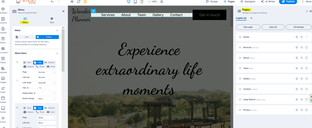 Στο σημερινό άρθρο θα συνεχίσουμε με την παρουσίαση συνοπτικών οδηγιών σχετικά με την χρήση του Sitejet Website Builder . Θα περιγράψουμε πως μπορείτε να επεξεργαστείτε κάποια βασικά elements τα οποία προσφέρει ο Sitejet Website Builder σε διάφορα σημεία του template . Θα διαπιστώσετε και εσείς όταν θα ξεκινήσετε να χρησιμοποιείτε τον Sitejet Website Builder ότι οι δυνατότητες επεξεργασίας είναι πολλές, άλλες πιο απλές και άλλες πιο εξειδικευμένες. Θα σας συμβουλεύαμε να επιλέξετε ένα template το οποίο να εξυπηρετεί τις ανάγκες σας , ώστε να μπορέσετε να το προσαρμόσετε εύκολα στο περιεχόμενο σας.