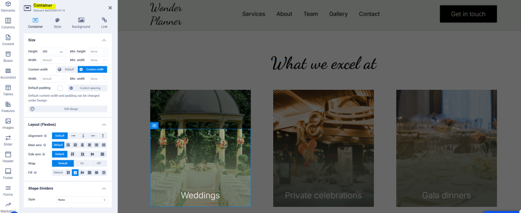 Για να επεξεργαστείτε τα banners του template σας, οδηγείστε στα elements και επιλέγετε το εικονίδιο container. Σε αυτό το σημείο μπορείτε να πραγματοποιήσετε τις παραμετροποιήσεις που επιθυμείτε. Όπως θα διαπιστώσετε υπάρχουν ρυθμίσεις layout, μεγεθών, χρώματος κ.ο.κ Θα πρέπει να ”μαρκάρετε” την περιοχή που επιθυμείτε να επεξεργαστείτε ώστε να σας εμφανίσει αριστερά τα πεδία που δέχονται επεξεργασία. Αυτό συμβαίνει γιατί μέσω της επιλογής container , μπορείτε να επεξεργαστείτε διάφορα σημεία στο template και όχι μόνο τα banners (δείτε τα κίτρινα σημεία στο screenshot).