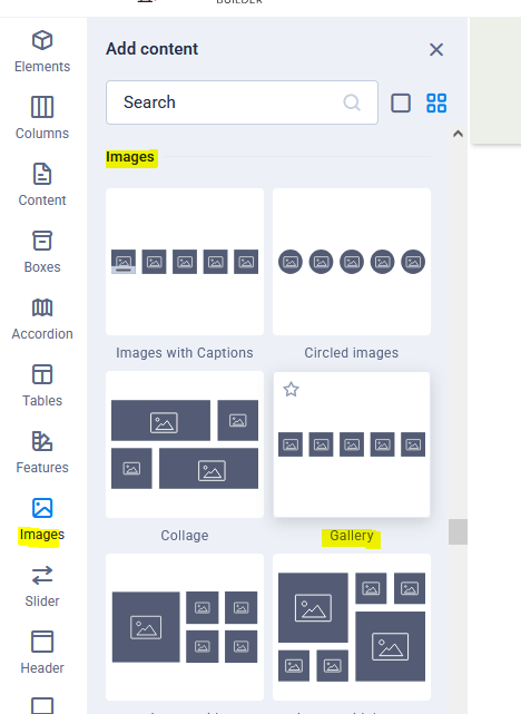 Μπορείτε και αυτό να το βρείτε στην αριστερή πλευρά, όπως κοιτάτε την οθόνη σας μέσα στο Site Website Builder .Θα πρέπει και εδώ όπως πριν να ”μαρκάρετε” την περιοχή που επιθυμείτε να επεξεργαστείτε και έπειτα μπορείτε να προσθέσετε ολόκληρη σειρά με εικόνες, σε διάφορα σημεία πχ πριν ,μετά το κείμενο, σε οριζόντια θέση κτλ (δείτε τα κίτρινα σημεία στο screenshot).