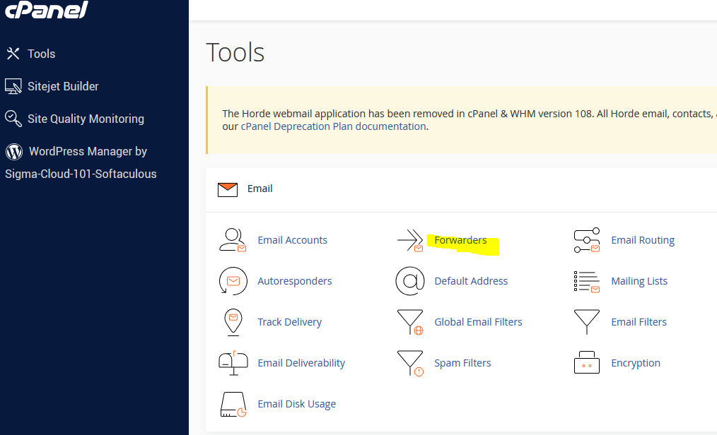 - Μπορείτε να ελέγξτε το cοntrol panel σας για πιθανούς forwarders που μπορεί να σας έχουν δημιουργήσει. Εφόσον χρησιμοποιείτε cpanel , δείτε στο παρακάτω screenshot που μπορείτε να βρείτε τους forwarders. Οι forwarders δημιουργούνται για να προωθείται η ληφθείσα αλληλογραφία και σε κάποια άλλη διεύθυνση ή μόνο σε κάποια άλλη διεύθυνση.
