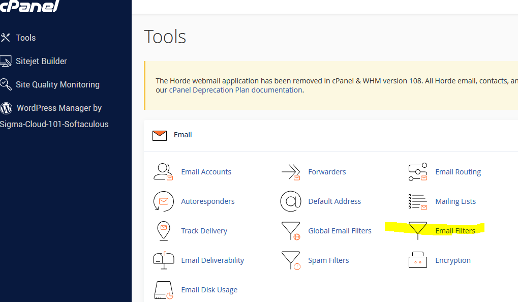 - Επίσης ένα ακόμη χρήσιμο εργαλείο είναι το email filters. Αποτελεί ένα πιο εξειδικευμένο εργαλείο και μπορείτε να το βρείτε στο cpanel σας. Δείτε το παρακάτω screenshot . Σε αυτό το σημείο αν δείτε δημιουργημένα φίλτρα με σύμβολα, σημαίνει ότι κατά πάσα πιθανότητα έχετε παραβιαστεί. Καλό είναι να το εξετάζει κάποιος γνώστης των control panel.